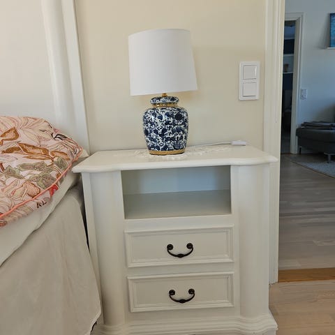 Två sängbord, vitpigmenterad ek, 28x25x24cm. Nypris: 4390kr