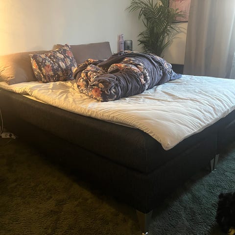 Mio säng med sänggavel i grått tyg. Sängen har en stoppad, knapplistad gavel och en bäddmadrass ovanpå resårbottnar i fastform på båda sidor. Sängen är 180cm bred