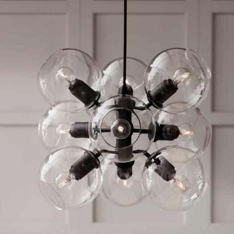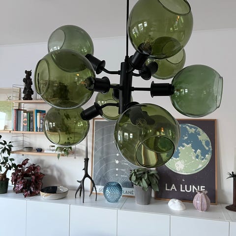 Tage taklampa, svart-klarglas, från CO Bankeryd har nio glasglober runt ett centralt fäste. En extra glasglob ingår.