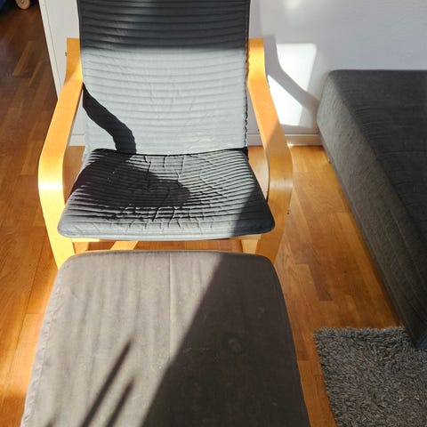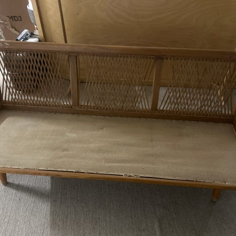 Fotpall i rotting/bambu. Kudden (inte original) ingår om man vill. Saknar kuddfodral men det är lätt att ordna. Begagnat skick, något fäste har släppt lite men det är inget som stör.