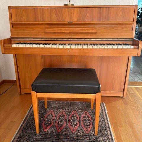 Akustiskt upprätt piano i brun träfinish. Pianot har fullstor klaviatur med vita och svarta tangenter samt traditionell mekanik med hammare och strängar. Medföljer matchande sittpall med stoppad sits. Passar för hemmabruk, övning och musikundervisning i vardagsrum eller musikrum.