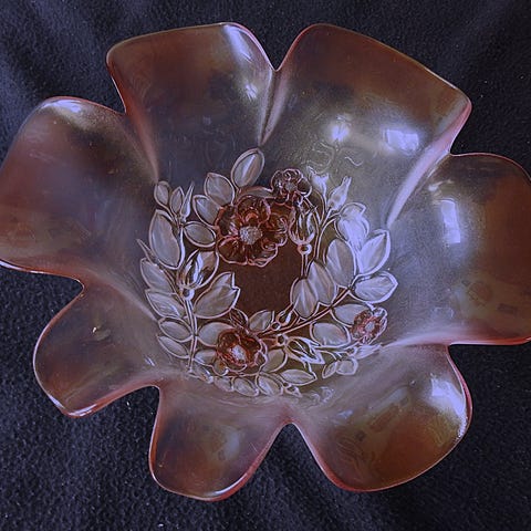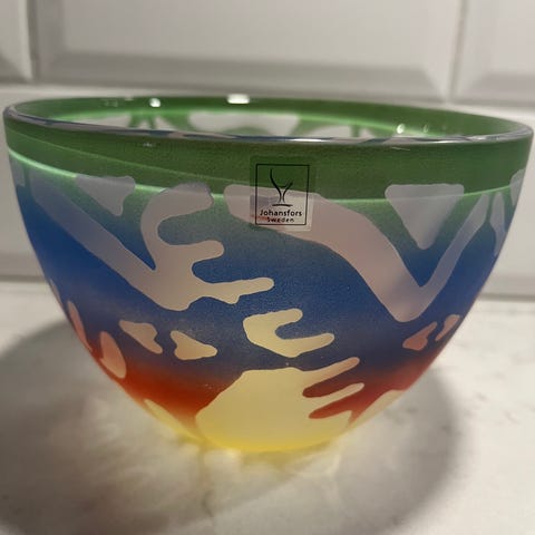 Glasfat i form av en skål i lila ton. Passar som serveringsfat, fruktfat eller dekorationsföremål i hemmet. Tillverkat i glas med mjukt rundad form.