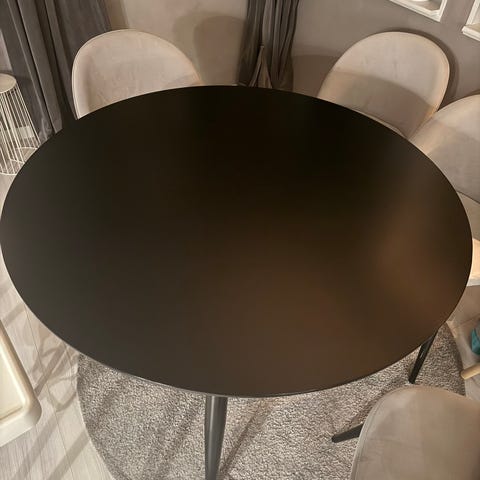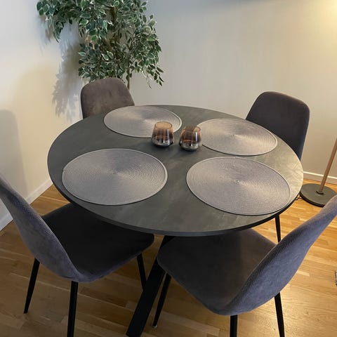 Runt matbord med stenskiva i Terazzo och fyra svartlackerade ben i trä