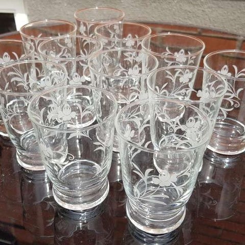 Set med 4 dricksglas i olika färger. Glasen är i genomskinligt färgat glas i rosa, blått, grönt och gult. Varje glas har ett mönster i glaset som ger struktur och dekorativt utseende. Passar för servering av vatten, juice eller andra drycker i hemmet eller vid dukning.