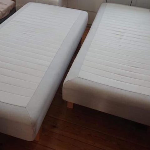 Två 90x200 sängar från IKEA. Medföljer tillhörande bäddmadrass och träben