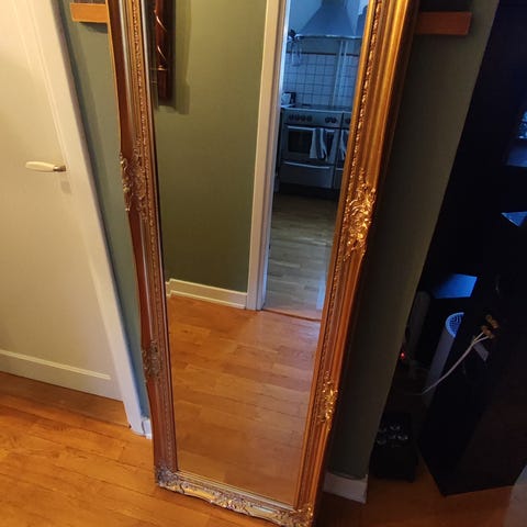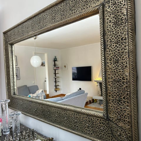 1) Rektangulär spegel med bred ram i metallicfärg. Spegeln är fristående mot vägg och passar exempelvis i hall, sovrum eller vardagsrum.