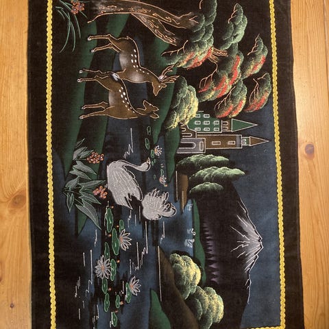 Väggbonad med naturmotiv föreställande hjortar vid en sjö med berg och skog i bakgrunden. Textil väggdekoration som kan användas som prydnad på vägg i exempelvis vardagsrum, hall eller fritidshus.