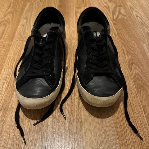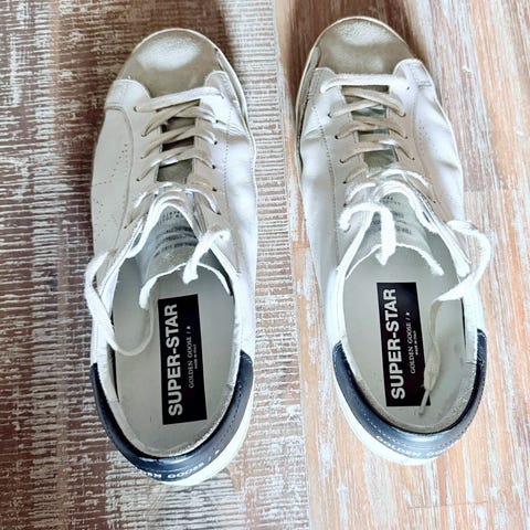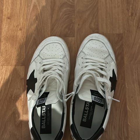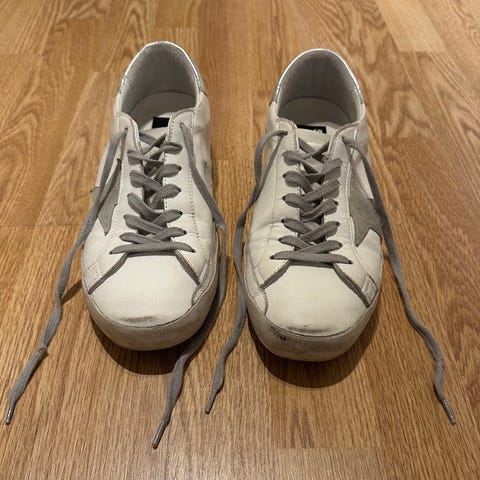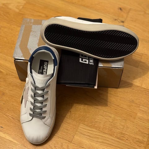 Golden Goose sneakers i storlek 43. Modellen är låga sneakers i vitt med grå skosnören, grå stjärndetalj på sidan och svart hälparti. Ovandel i slätt material med gummisula och klassisk snörning. Skorna levereras med originalkartong och tygpåse enligt bild. Passar som vardagsskor eller fritidsskor.