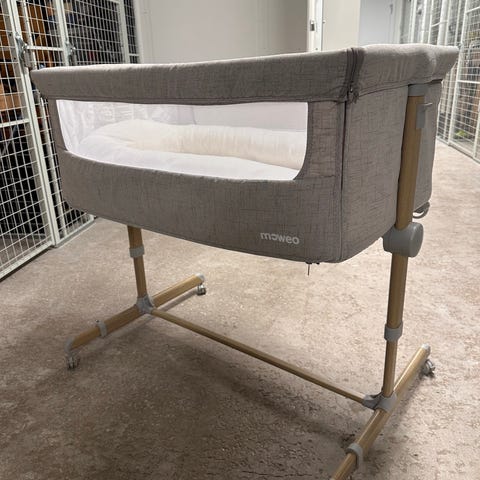 Moweo bedside crib spjälsäng i grå textil med svart stativ. Sängen är avsedd att stå intill föräldrasängen och har öppningsbar sida med nätparti för insyn och luftcirkulation. Madrass ingår. Lämplig för spädbarn under den första tiden, både som fristående säng och som sidosäng vid vuxensäng.