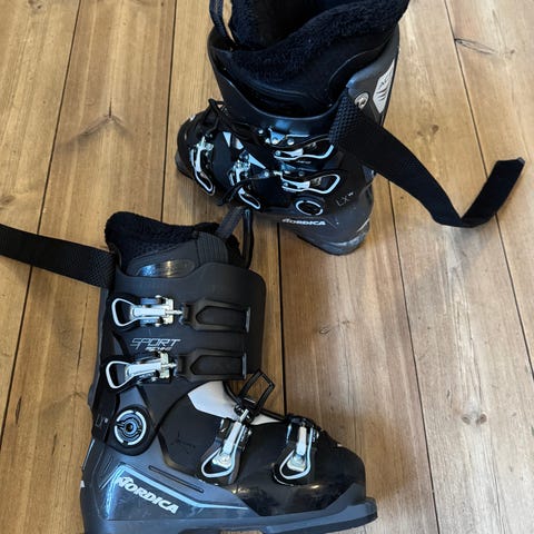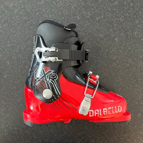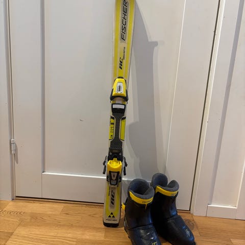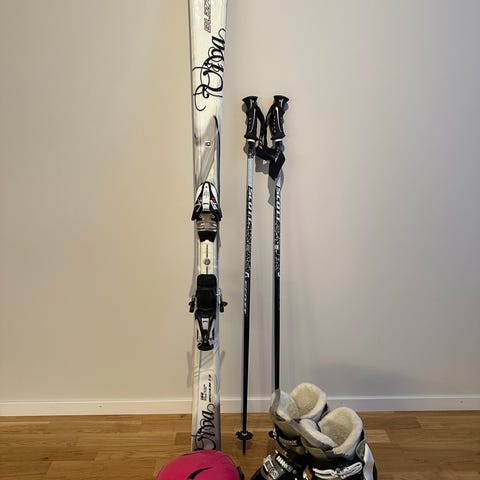Alpinskidorna från Blizzard är utrustade med integrerade bindningar, 90 cm. Hjälmen från Jofa är en hård hjälm med ventilationsöppningar och hakrem. Pjäxorna från Nordica är barnpjäxor med två spännen och vadderad insida.