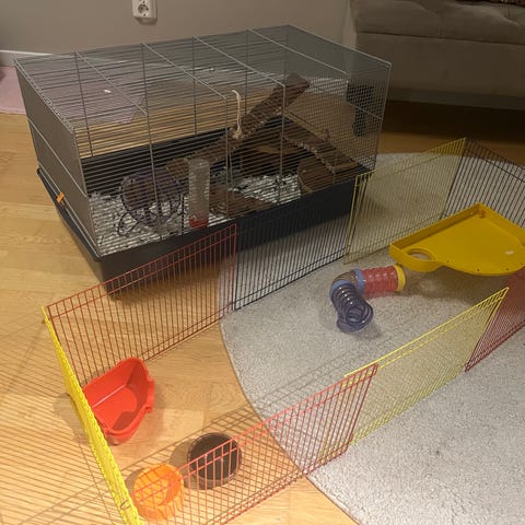 Egentillverkad bur för smådjur som tex hamster,möss,marsvin. Många tillbehör som leksaker, inredning,skålar & hus. Tillverkad av Osb & plexiglas. Mått 120cmx60cmx60cm