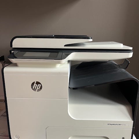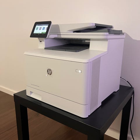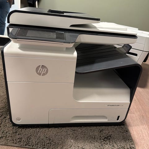 HP skrivare multifunktion i vit färg. Enheten är avsedd för kontor eller hemmabruk och kombinerar flera funktioner i en och samma maskin. Utrustad med dokumentmatare upptill och kontrollpanel med display och knappar på sidan. Passar för utskrift, kopiering, skanning och Wifi anslutning.