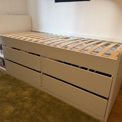 IKEA utdragbar barnsäng i vit färg. Sängen består av en övre sängdel samt en utdragbar nedre del som kan användas som extra sängplats. Under sängen finns lådor för förvaring av till exempel sängkläder eller leksaker. Passar i barnrum där man vill kombinera sovplats och förvaringsmöjligheter på liten yta.