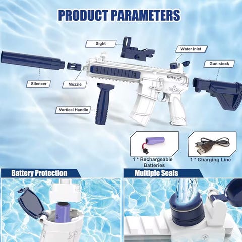 Vattenpistolen är eldriven och skjuter vatten automatiskt i ett kontinuerligt flöde. Den har en stor vattenbehållare som gör att man kan leka längre utan att behöva fylla på ofta. Den är enkel att använda och passar bra för barnens utomhuslek under sommaren.