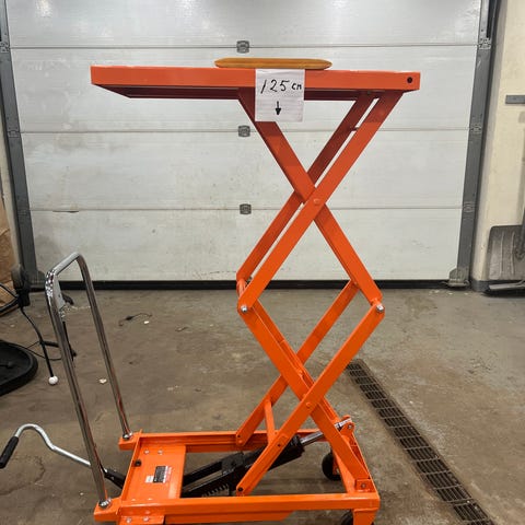Hydrauliskt saxlyftbord för lyft och sänkning av gods i verkstad eller lager.