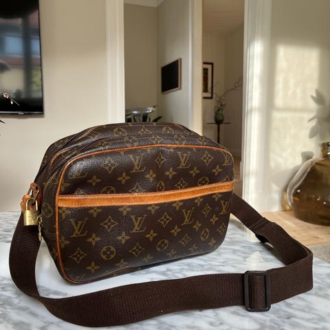 Köptes på tradera för 3700 i detta skick några år sen det är bytt axelrem och man ser tydliga tecken på vintage. Det är olika fästen på sidorna av väskan men fullt funktionell.