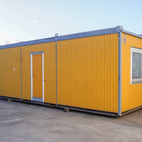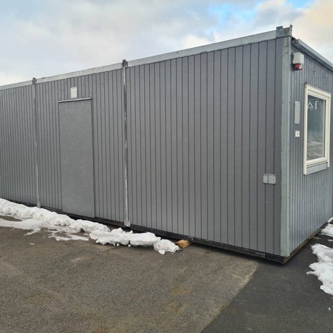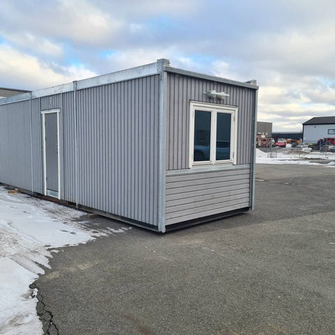 Byggbod personalbod med omklädningsrum och dusch. Utsida med träpanel och fönster med galler. Invändigt finns omklädningsdel med skåp, bänkar och krokar samt duschutrymme med draperi och tvättställ. Bodens planlösning lämpar sig för användning som personalutrymme på byggarbetsplats eller liknande verksamhet. Elradiator och elinstallationer är dragna invändigt.