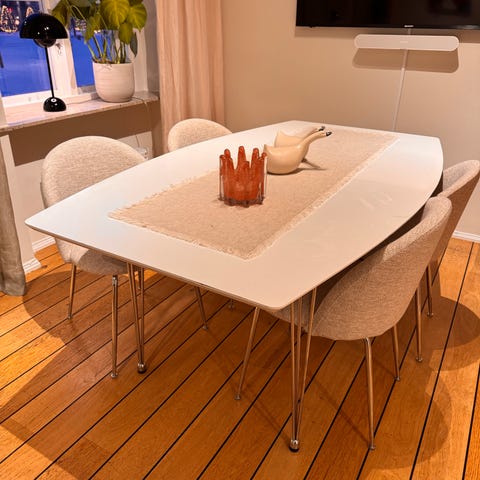 Ljusbeige med kromade ben.