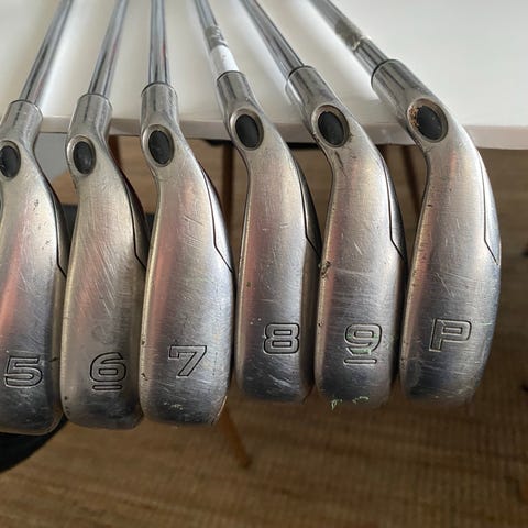 TaylorMade RBZ järnklubbor set 4-PW. Setet består av flera järnklubbor i samma modellserie, med metallhuvuden och svarta grepp. Klubborna är avsedda för golfspel och passar som komplett järnset på banan. Exakt skafttyp, flex och antal klubbor framgår inte av bilderna och kan kontrolleras vid behov. Skaftet är R och det finns inga defekter med några av klubborna .