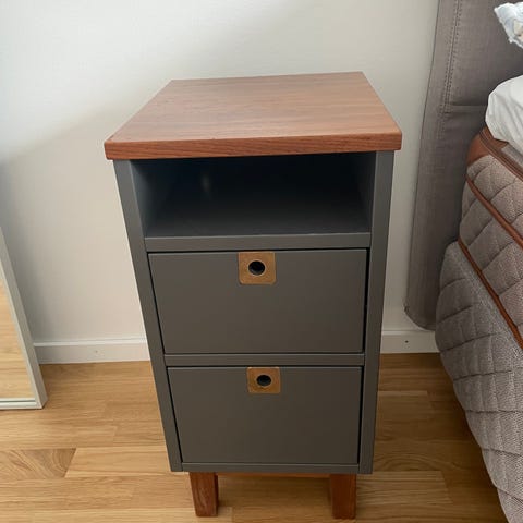 Stilrent sängbord med två lådor och träben. Stabil konstruktion, byggt i MDF/plywood. Passar bra som nattduksbord, sidobord eller litet förvaringsskåp.