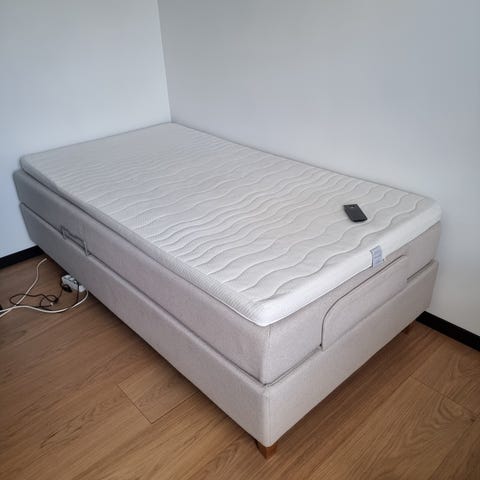 Härligt komfortabel Ställbar säng med madrass i vit färg. Sängen har elektrisk justerbar funktion med fjärrkontroll, vilket gör att huvud- och fotända kan höjas och sänkas. Passar som enkelsäng i sovrum eller gästrum. Ytmaterialet på madrassen är slätt och ljust, och sängramen har en neutral, ljus kulör som är lätt att kombinera med annan inredning. Prisidé 750 kr. Prutmån vid snabb affär.