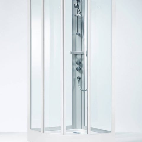 Duschkabin med värmeåtervinning. Kabinen har skjutdörrar med handtag och inbyggd duschblandare med duschhandtag. Passar för installation i badrum där en fristående duschlösning önskas. Utförd i glas och metall/plast med upphöjd duschbotten.