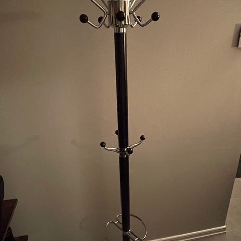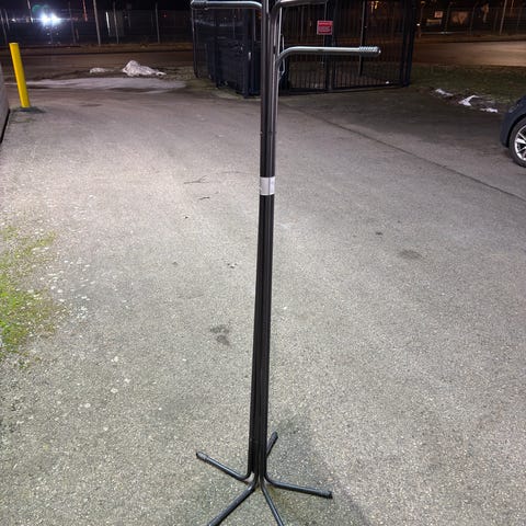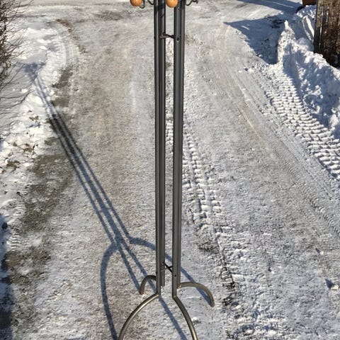 Ett fyrarmsställ med lutande armar, höj- och sänkbart. Kromade armar och svarta ben.
