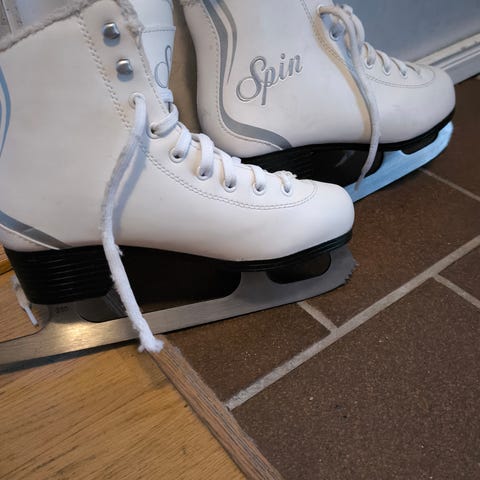 Spin skridskor för barn i storlek EU 32 (ganska smal design så passar även en mindre fot). Klassisk vit modell med taggar och hög skaftdesign som ger stöd åt fot och fotled. Yttermaterial i syntet med fodrad insida för ökad komfort.