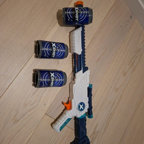 Vattenpistolen är batteridriven och skjuter vatten automatiskt i ett kontinuerligt flöde. Den har en extern vattenflaska som ger stor kapacitet och gör att man kan leka längre utan att behöva fylla på ofta. Den är enkel att använda och bekväm att hålla i.