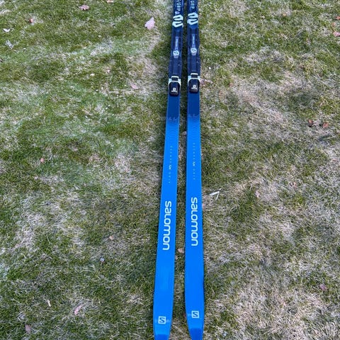 Atomic längdskidor med bindningar i röd färg. Skidorna är avsedda för längdskidåkning och har monterade bindningar som syns på bilderna. Passar för användning i preparerade spår. Exakt modell, längd och målgrupp framgår inte av underlaget.