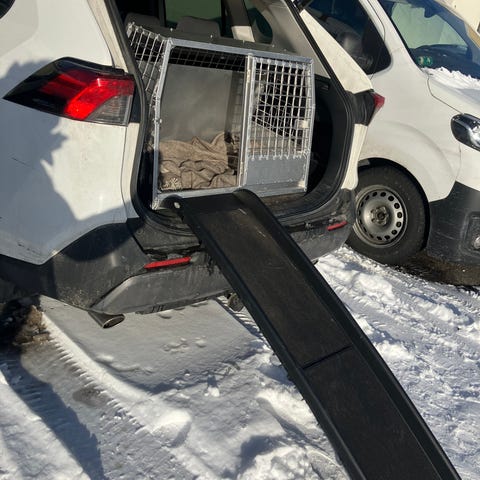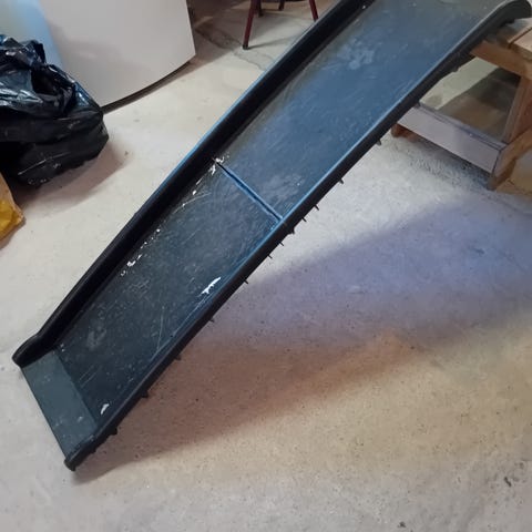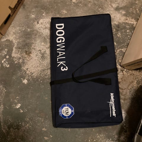 Hundrampen är för medelstora och stora hundar. Stabil konstruktion. Stativet är av svart aluminium och har en halksäker textil ovansida. Den är i 4 sektioner och kan vecklas ut till ca 180 cm. Den passar alltså även till en SUV. Den väger ca 8 kg. Skicket är som nytt, använd en gång. Levereras i originalkartong.