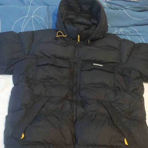 Everest vinterjacka för herr i storlek XL. Jackan är blå och fodrad med dun och fjäder (80 % dun, 20 % fjäder) enligt tvättrådsetiketten. Yttertyg och foder är i nylon. Modellen har huva och är quiltad för jämn fördelning av fyllningen. Passar för kallare väder och vardagsbruk utomhus under vintersäsong.
