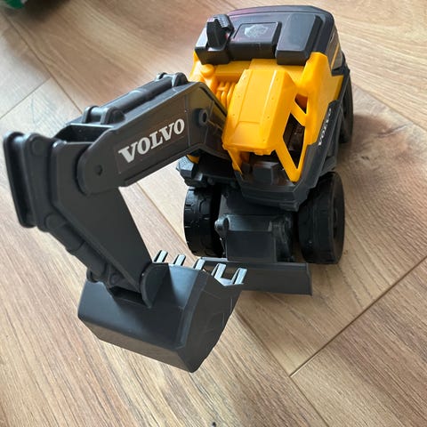 Plasto leksakslastbil i form av en timmerbil i plast. Lastbilen har röd hytt, svart chassi och kran samt gula stöttor på släpet. Fordonet består av dragbil med kran och separat släp med plats för timmerstockar. Passar för lek inomhus och utomhus på hårda underlag eller i sandlåda. Tillverkad i tålig plast anpassad för barnlek.