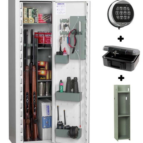 Har idag ett Enoch 1250 som har måtten Längd 48, bredd 30, höjd 125 cm. Detta är är godkänt enligt SS3492. Till skåpet finns fler hyllor samt gevärsställ som inte syns på bild. 2 nycklar finns även till.