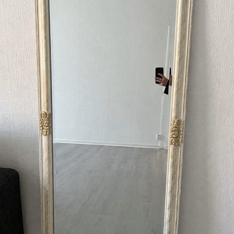 Jysk spegel med svart ram. Rektangulär helkroppsspegel som kan lutas mot vägg eller hängas upp beroende på upphängning. Passar i hall, sovrum eller vardagsrum för helfigursspegling och som inredningsdetalj.