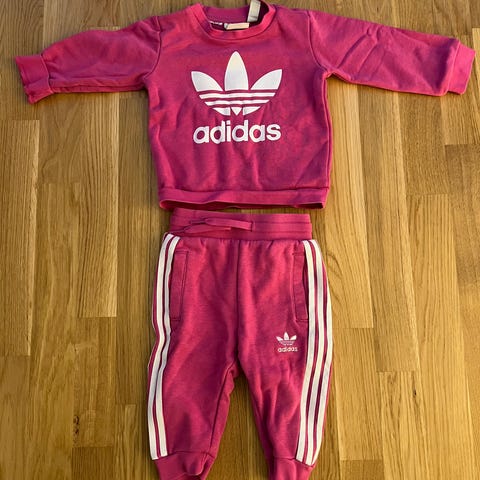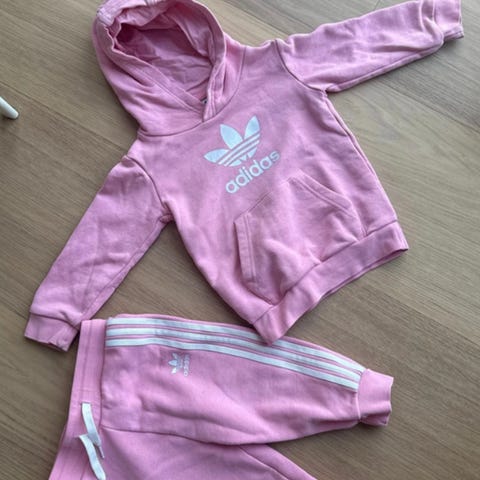 Nike set barnkläder för flicka i storlek 80-86 (18 mån). Setet består av en rosa huvtröja med dragkedja, ett par rosa byxor samt en rosa kortärmad body. Plaggen är i mjukt material och passar för vardagsbruk.