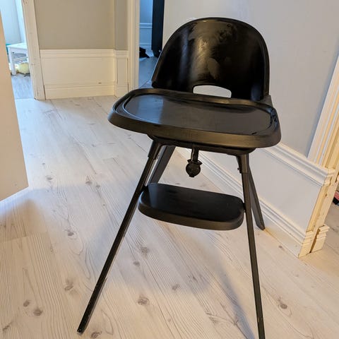 IKEA matstol för barn med svartvit mönstrad sits och ryggstöd. Passar som matstol vid köksbord eller matplats för små barn som behöver sitta stadigt vid måltider.