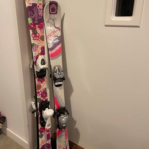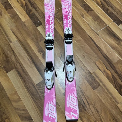 Barnskidor i två färger, en rosa och en blå. Skidorna har integrerade bindningar som är justerbara efter pjäxstorlek. Passar för alpinskidåkning för barn. Lämpliga för användning i preparerade backar. 107cm