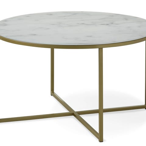 Snyggt soffbord med marmormönstrad glasskiva och guldfärgad stomme i väldigt fint skick.
