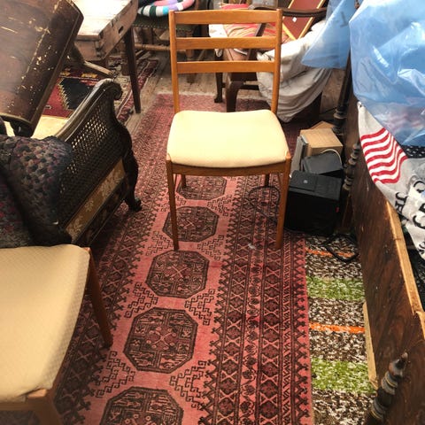 Två stycken stolar i teak med ljusbrun sittdyna.