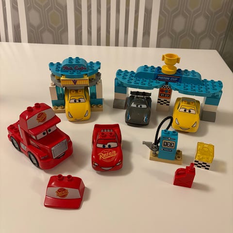 Lego Duplo Disney lekset med flera fordon och figurer. Setet innehåller bland annat ett orange flygplan, bärgningsbil, bil, motorcykel med förare samt byggdelar till en enkel verkstad eller serviceplats med ramp och tillbehör. Klossarna är anpassade för små barn med större delar som är lätta att greppa. Passar för lek med fordonstema och rolllek där barn kan bygga upp egna scener med bilar och flygplan.