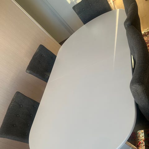 IKEA matgrupp ROSENTORP, bordet med möjlighet att förlänga med en extra skiva som finns under. 4 stolar i samma serie ingår. Matgrupp är använd och har repor (se bild!)