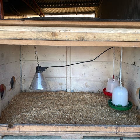 Kläckmaskin i orange plast med genomskinligt lock och digital kontrollpanel. I lådan finns tillbehör som vatten- och foderautomater samt gallerbotten för ägg eller kycklingar. Produkten är avsedd för kläckning av ägg och uppfödning av fjäderfä i mindre skala, till exempel i hobbyverksamhet eller på mindre gårdar.