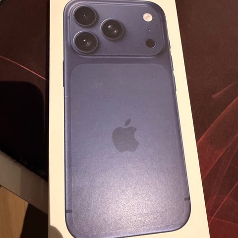 Blå iPhone 17 Pro Max mobiltelefon med 1 TB lagringsutrymme. Modellen har USB‑C-anslutning enligt informationen på förpackningen. Levereras enligt text på kartongen med iPhone 17 Pro Max och USB‑C-laddkabel.