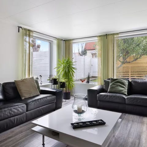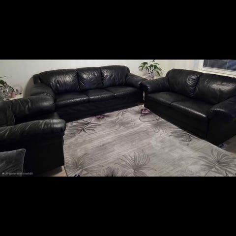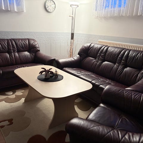 Soffgruppen är i äkta skinn och erbjuder mycket god sittkomfort. Klassisk och tidlös design som passar både vardagsrum och större sällskapsytor. Väl omhändertagen, rök- och djurfritt hem.