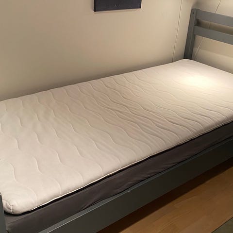 IKEA säng med metallram i grå färg. Sängen har ribbotten och är avsedd för en madrass i standardstorlek för vuxen. Passar som säng i sovrum eller gästrum.