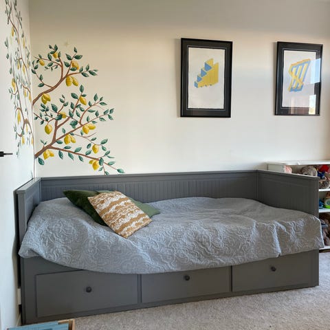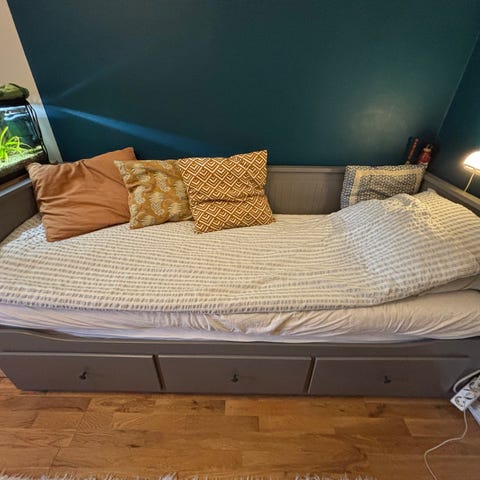 IKEA Hemnes dagbädd med tre förvaringslådor nedtill, inköpt för ca 1 år sedan. Dagbädden har fungerat utmärkt som soffa dagtid och säng nattetid. Dessutom har det varit väldigt smidigt att kunna dra ut till dubbelsäng vid behov.