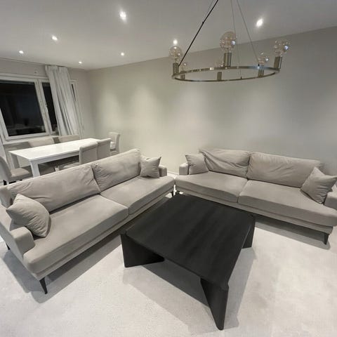 Fin soffgrupp i färgerna mörkgrå och beige.