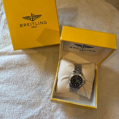 Till salu landar Breitling blå gummi med viklås. Passar handled upp till 19cm . Använd skick . Bilder är en del av beskrivningen. Ny kostar 6000kr