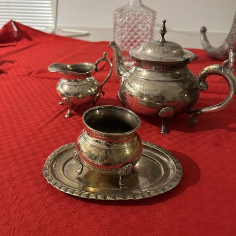 Thekanna, gräddkanna och sockerskål. Nysilver.